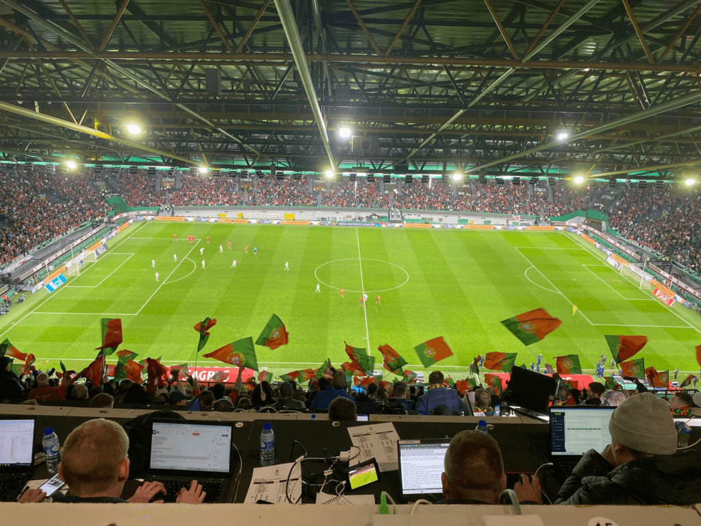 Aproveito para vos revelar que hoje sinto-me um privilegiado aqui nesta varanda, porque, além de o farnel da Federação Portuguesa de Futebol não ser nada mau – uma sandes de carne, um sumo e uma água, um pacote de batatas fritas e um chocolate –, tenho aqui um relato radiofónico em directo, por via dos meus camaradas do lado direito, da FlashScore. Como sou algo pitosga, é uma vantagem saber quem passa e quem remata.