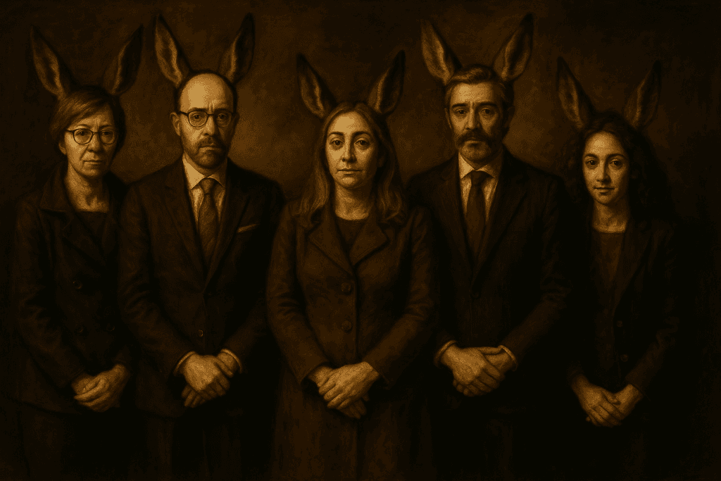 Até aqui, tudo bem. Eu ronronava de orgulho enquanto o via rever vírgulas com um olhar de inquisidor matemático. Mas eis senão quando… no momento de ilustrar visualmente a dita burrice estatística e institucional, o Pedro — pasmem-se! — acanhou-se. Auto-censurou-se. Cortou uma das ilustrações preparadas. Uma que, à minha felina sensibilidade, era de uma justeza simbólica irresistível: mostrava, de forma expressiva, os cinco membros do Conselho Regulador da ERC com umas encantadoras, e cientificamente apropriadas, aurículas asininas.