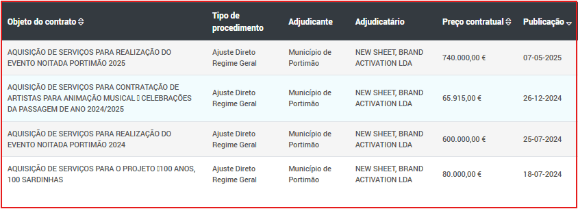 A organizadora é uma empresa com sede em Paço de Arcos, Oeiras — a New Sheet, Brand Activation —, que, depois de ter conseguido ‘vender’ o evento ao executivo camarário de Portimão em 2024, voltou a conseguir novo contrato este ano. Ambos os contratos foram adjudicados por ajuste directo, alegando-se direitos de autor.