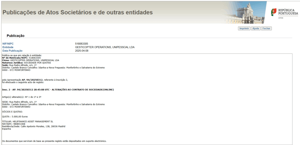 A entrada de Ricardo Leitão Machado na Gesticopter fez-se através da Helifinance Asset Management, uma sociedade espanhola com sede em Madrid, constituída em Fevereiro de 2024. Formalmente, a compra da Gesticopter Operation, por valores desconhecidos, ocorreu a 12 de Março deste ano, segundo os registos comerciais consultados pelo PÁGINA UM.
