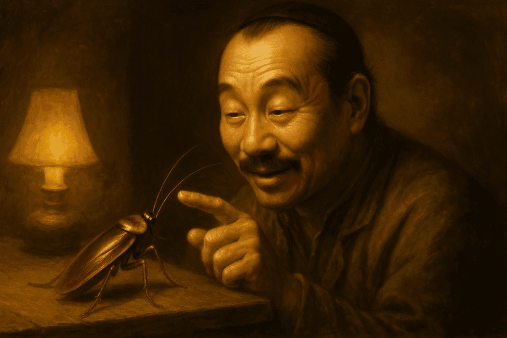 Um dia, ia a subir a rua e a voltar para casa e quase levei uma bengalada na carapaça de um homem com cara de mau. No dia seguinte, vim para aqui. Este senhor chinês é muito simpático e, além de me dar comida, não se importa que traga as minhas amigas para brincarmos. O que eu mais gosto é de voar nas asas da Antónia e passarmos em cima do fogão quando a comida está ao lume. A Antónia voa melhor do que muitos passarinhos.