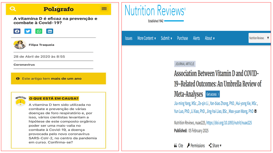 E sobretudo veja-se o caso da vitamina D, com provas acumuladas sobre o seu papel imunológico, transformada em suplemento menor por não trazer dividendos a multinacionais. Afinal, há mais lucro em administrar fármacos novos a milhões do que em distribuir sol e bom senso. Logo no início da pandemia, esse arauto do Jornalismo e da Ciência — estou a ironizar — chamado Polígrafo (e seguido por outros) tratou logo de menorizar a utilidade da vitamina D na prevenção e tratamento da covid-19. Isto, claro, com a imprescindível ajuda de um dos maiores mercenários da indústria farmacêutica, Filipe Froes.