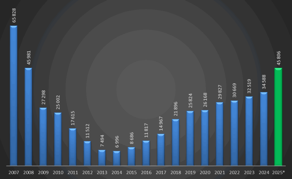 Com efeito, entre Janeiro e Abril do presente ano foram licenciados 13.467 novos fogos, o que, considerando os ritmos de licenciamento ao longo dos meses, permite estimar que 2025 chegará a um total próximo dos 46 mil fogos. Tem de se recuar a 2008 para encontrar valor similar.