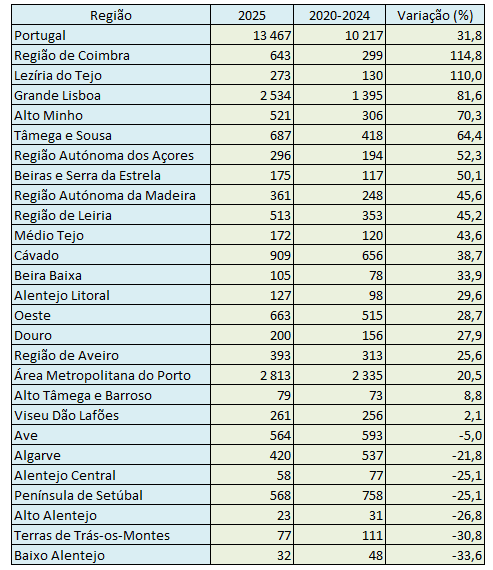 A análise regional dos dados expõe uma realidade bastante dual. Regiões como as de Coimbra, Lezíria do Tejo, Grande Lisboa, Alto Minho e Tâmega e Sousa apresentam crescimentos superiores a 60% face à média do quinquénio anterior — sendo que Coimbra, com 643 fogos licenciados, mais do que duplicou o valor médio dos cinco anos anteriores.