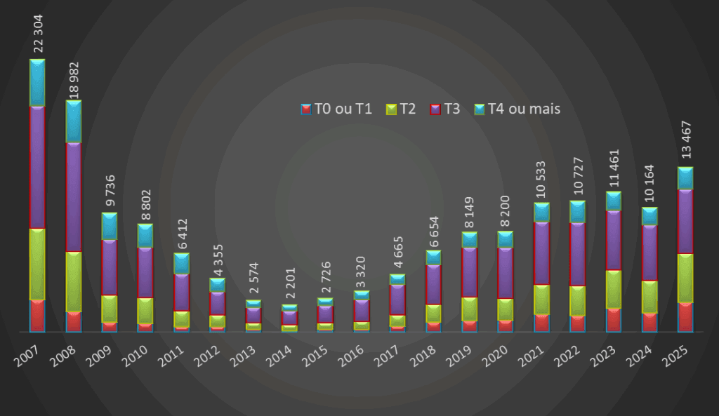 Com efeito, a tipologia T4 ou superior — ou seja, de habitação familiar com espaço e estabilidade — recuou significativamente. Nos primeiros quatro meses deste ano, apenas 1.716 fogos desta categoria foram licenciados em todo o país, o que representa apenas 12,7% do total, quando em 2007 representavam 16,7% (com 3.723 unidades). Em todo o caso, em termos absolutos, o número de fogos com tipologia T4 ou superior é o maior desde 2010.