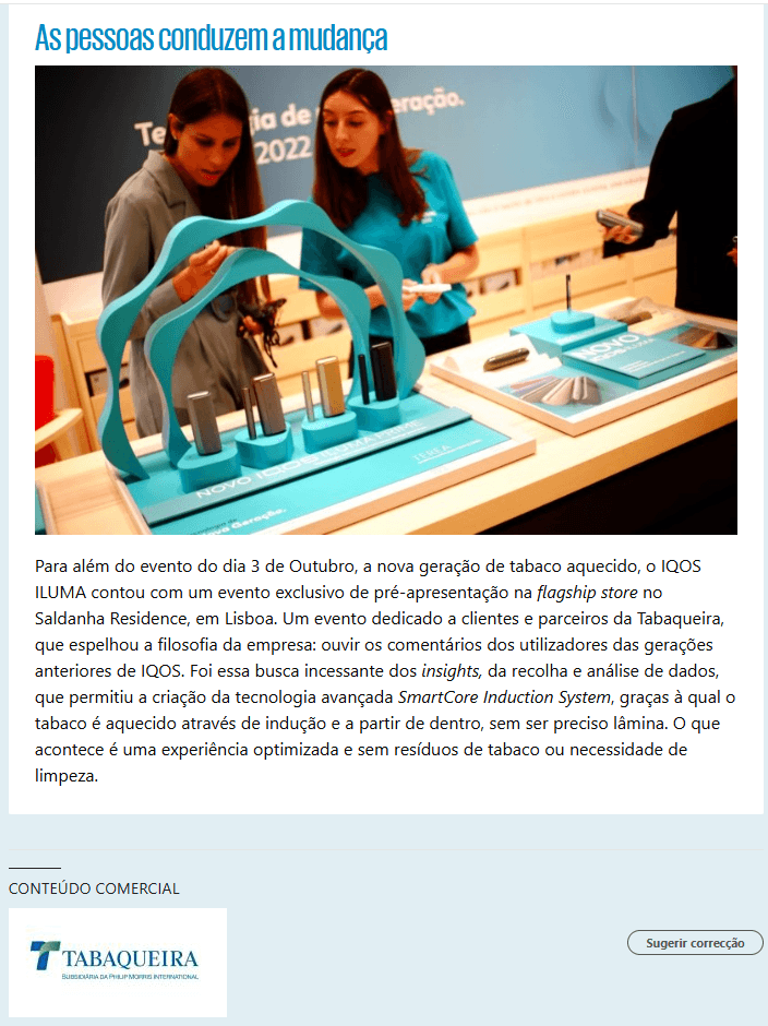 Saliente-se que este caso remonta ao início de Outubro de 2022, quando o jornal Público publicou um conteúdo comercial da Tabaqueira, coincidente com o lançamento do sistema de tabaco aquecido por indução IQOS Iluma. O artigo, publicitado como “conteúdo comercial”, elogiava a tecnologia da nova geração da Philip Morris, empresa-mãe da Tabaqueira, e era acompanhado de uma imagens de carácter claramente publicitário, incluindo fotografia do director da Tabaqueira com um novo produto de tabaco lançado poucos dias antes.