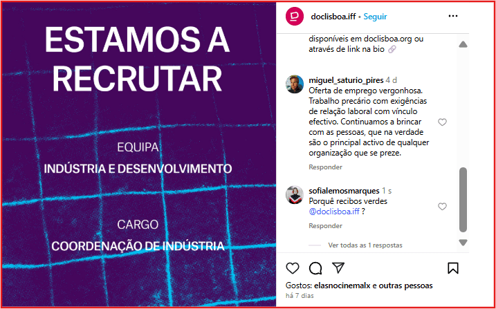 Uma outra utilizadora desta rede social questionou: “porquê recibos verdes?” Em resposta a esta pergunta, a Apordoc indicou que “esta é uma vaga para a equipa temporária que o festival contrata a cada edição, dezenas de pessoas que, pela natureza do projecto, trabalham connosco apenas durante uns alguns meses por ano”. “Acrescentou que “todas as pessoas que fazem parte da equipa permanente do Doclisboa têm contrato de trabalho e tentamos dar as melhores condições possíveis à nossa equipa”.