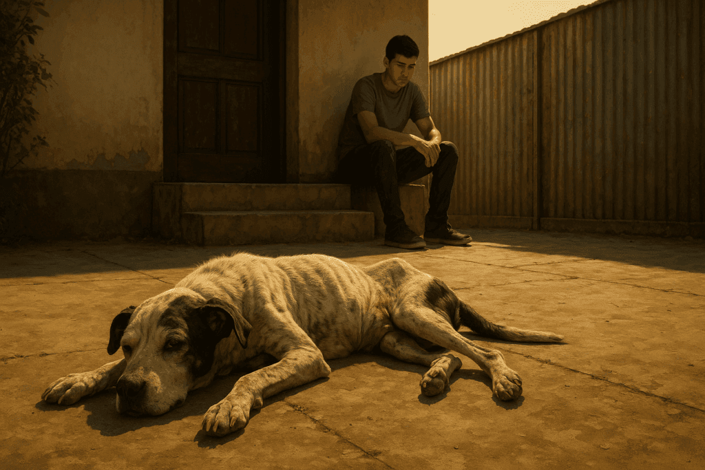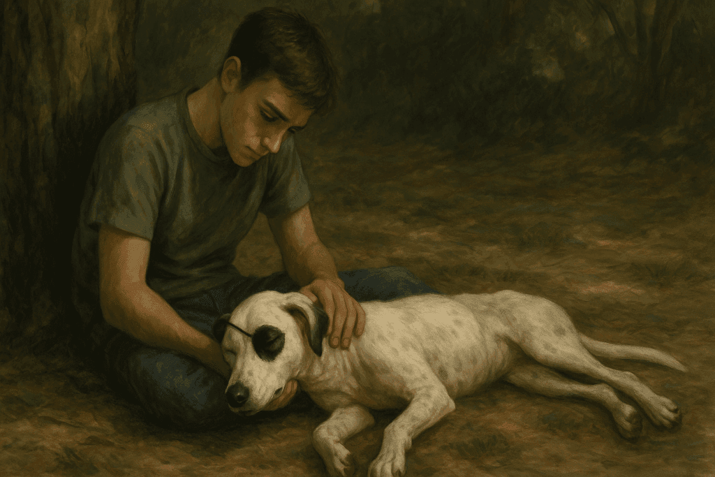 A grande cadela magérrima e ossuda estava deitada sobre as pernas do rapaz que, sentado no chão, recostado contra o tronco da pitangueira, tinha a cara tisnada de tristeza.
