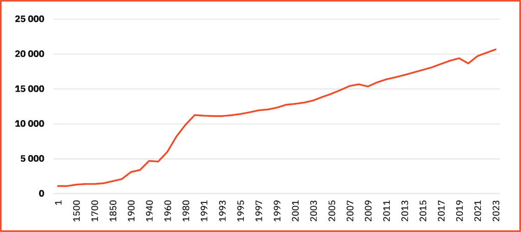 (Unidade: Dólares internacionais a preços de 2021) / Fonte: OurWorldinData.org; Dados compilados a partir de várias fontes pelo Banco Mundial (2025); Bolt e van Zanden – Base de Dados do Projecto Maddison 2023; Base de Dados Maddison 2010