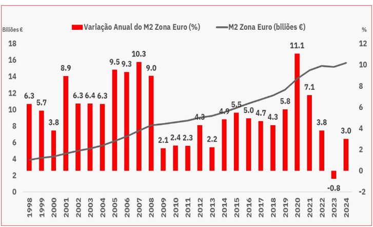 Contudo, importa compreender que a actual dinâmica inflacionista no mercado imobiliário nas zonas mais urbanas não resulta apenas de factores migratórios ou do crescimento turístico. A verdadeira raiz está na política dos bancos centrais dos últimos anos. Entre 2020 e 2022, só o Banco Central Europeu contribuiu para a expansão em mais 20 biliões de euros (milhões de milhões) o agregado monetário M2 — ou seja, a soma de moeda em circulação e depósitos de curto prazo.
