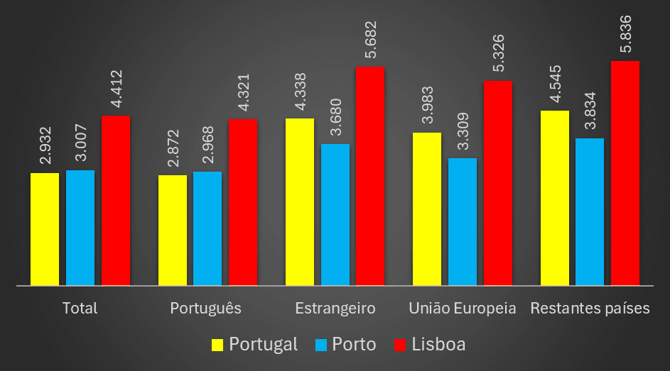 A desagregação dos dados do INE permite perceber que essa discrepância é particularmente acentuada entre os compradores oriundos de países extracomunitários. Em Lisboa, os cidadãos de fora da União Europeia pagaram um valor mediano de 5.836 euros por metro quadrado — mais 1.515 euros do que os compradores portugueses e mais 510 euros que os próprios cidadãos da União Europeia (que pagaram, em média, 5.326 euros). No Porto, o mesmo fenómeno repete-se, com os extracomunitários a pagarem 3.834 euros por metro quadrado, superando em 341 euros os compradores comunitários e em 866 euros os compradores nacionais. ↓