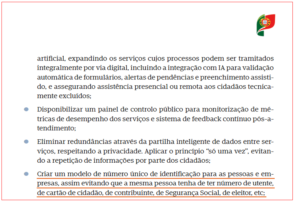 Trata-se da proposta de criação de um “modelo de número único de identificação para as pessoas e empresas”, justificada no documento governamental como forma de evitar “que a mesma pessoa tenha de ter número de utente, de cartão de cidadão, de contribuinte, de Segurança Social, de eleitor, etc.” Mas a desburocratização significa também maior devassa da vida privada dos cidadãos por parte do Estado.