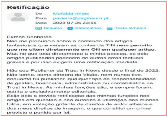 Apesar da clareza dos factos, a então directora da revista Visão, Mafalda Anjos — que acumulou durante anos o cargo de publisher do grupo — preferiu insultar a inteligência alheia, classificando as notícias do PÁGINA UM como “fantasiosas”. Talvez lhe parecesse fantasia que uma empresa de capital social de 10 mil euros, criada por Luís Delgado, tivesse adquirido à Impresa de Pinto Balsemão um portefólio de 16 títulos de imprensa escrita. Talvez lhe parecesse fantasia que a ERC, mesmo após a criação do Portal da Transparência, nunca tivesse analisado seriamente nem o negócio de 2018 nem a contabilidade anual da Trust in News, onde ano após ano as dívidas ao Estado cresciam, mas eram escondidas, enquanto se acumulavam “outras contas a receber” de natureza inexplicada.