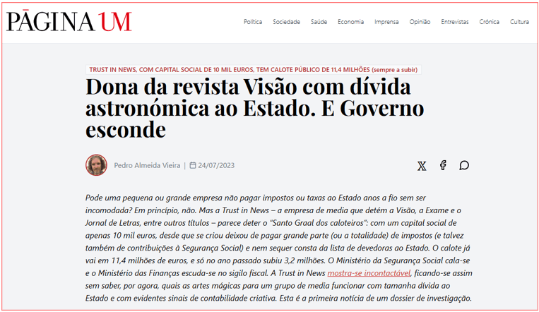 Na próxima quinta-feira, 24 de Julho de 2025, cumprem-se exactamente dois anos sobre a publicação no PÁGINA UM de uma investigação que — por muito que alguns quisessem ridicularizar, desprezar ou silenciar — expunha, com base nas demonstrações financeiras da própria empresa, a ruína anunciada da Trust in News. O título era inequívoco: “Dona da revista Visão com dívida astronómica ao Estado. E Governo esconde.” Não se tratava de conjecturas nem de insinuações, mas de números, factos e documentos oficiais. Era jornalismo, e dos mais incómodos.