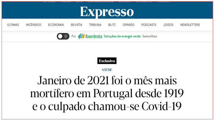 Sob o título “Janeiro de 2021 e a COVID-19 em Portugal: o mês mais mortal desde 1919”, o artigo pretende convencer-nos, numa sucessão de frases vagas e comparações grotescas, de que o impacto da pandemia em Portugal rivaliza com o da gripe espanhola, que teve o seu auge em 1919. A narrativa começa pela cronologia: 1.150 dias de pandemia, de Março de 2020 a Maio de 2023, 26.655 mortos atribuídos à COVID-19, com um pico de 5.805 óbitos em Janeiro de 2021. ↓