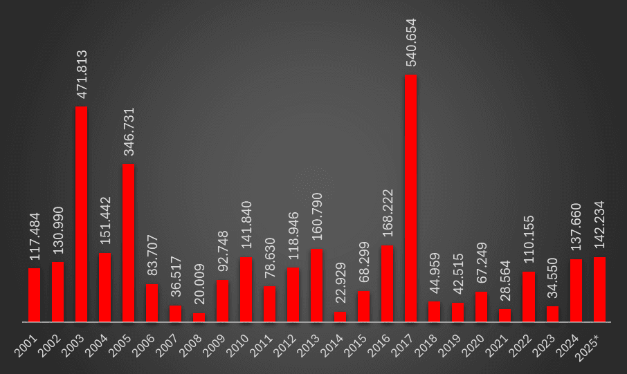 Este comportamento está longe de ser mero acaso. Resulta, em grande medida, de um ciclo perverso que tem acompanhado o país há décadas: anos de destruição em larga escala sucedem-se a períodos de relativa calma, não porque a prevenção funcione, mas porque os territórios já queimados funcionam como tampão, impedindo que novos fogos encontrem combustível fácil. Assim foi em 2003, 2005 e 2017, anos de catástrofe, e assim se repete agora em 2025. As condições meteorológicas e o caos prevêem que venham a ser ultrapassados os 200 mil hectares.