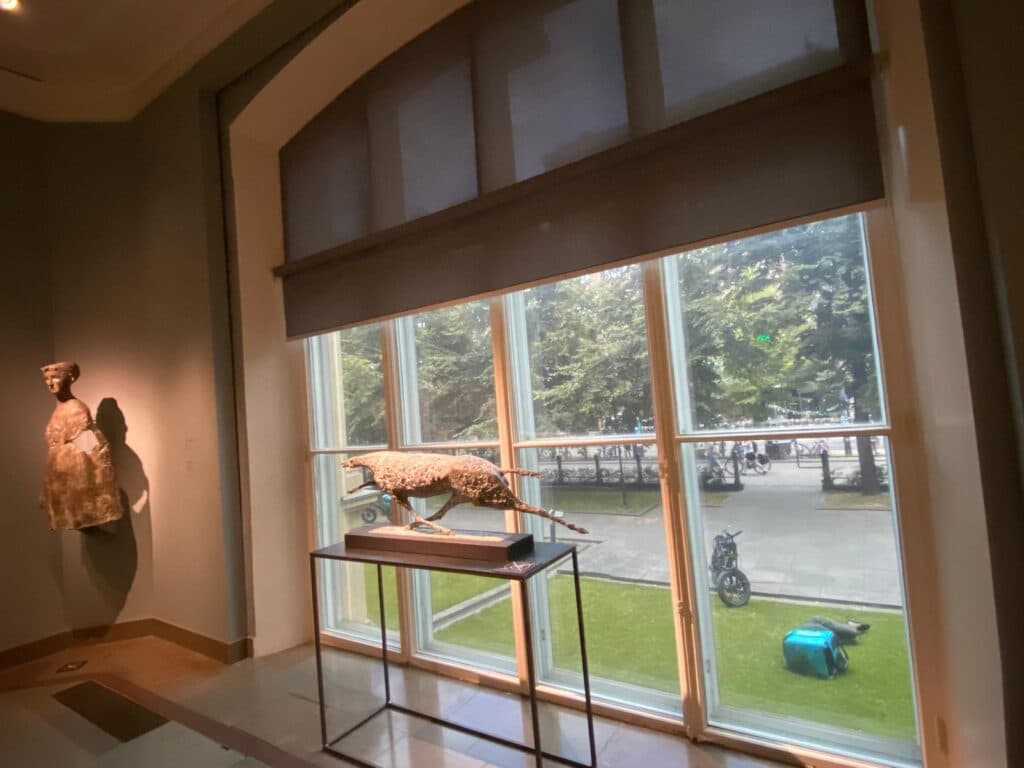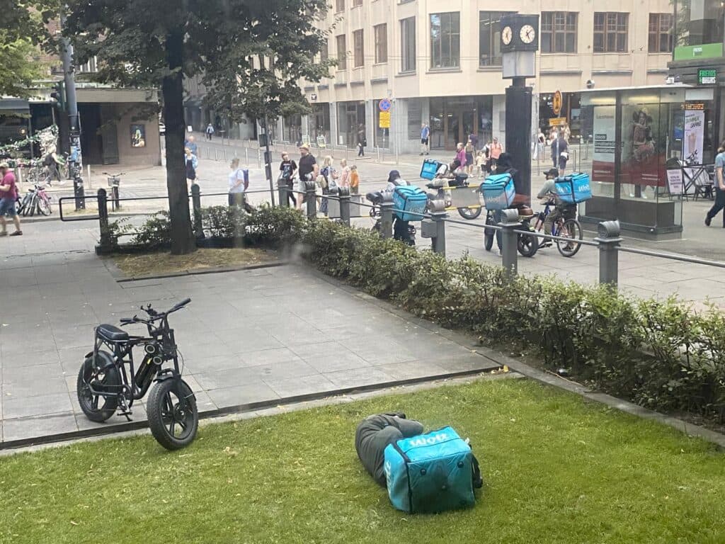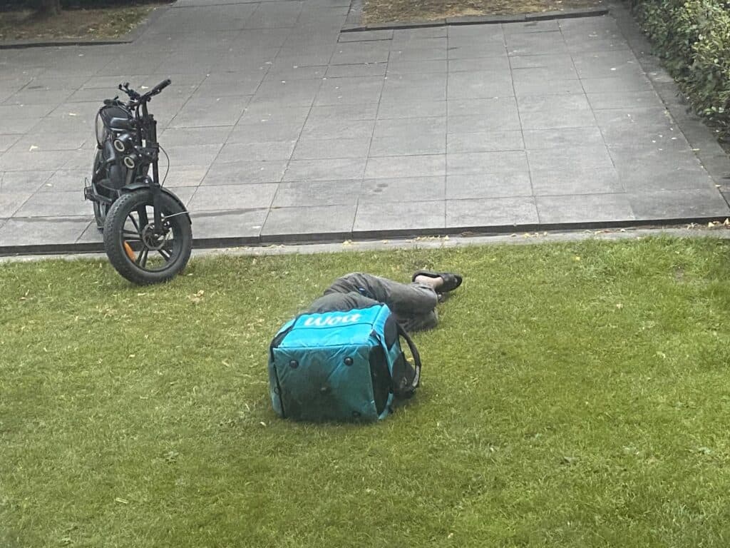 Mas foi numa das salas com uma janela que dava para um pequeno jardim que encontrei uma imagem pungente da condição humana nestes tempos de imigração e de trabalho desumanizante. No pequeno relvado, jazia um adormecido entregador da Uber Eats, com a bicicleta ao lado, num cenário digno da pena de Zola ou de Dickens, enquanto em redor uma dezena de outros ciclistas — colegas ou concorrentes — aguardavam o próximo pedido.