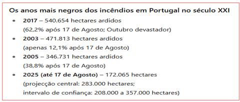 Em 2025, quando ainda se está em pleno mês de Agosto, a contabilidade dos incêndios já atingiu 172.065 hectares de área ardida, segundo dados do Instituto da Conservação da Natureza e das Florestas (ICNF), sendo o quarto pior do século, somente atrás de 2017, de 2003 (471.813 hectares) e de 2005 (346.731 hectares). Estes três anos vieram, aliás, colocar o patamar da destruição dos incêndios rurais num nível impensável no século XX, quando um “ano mau” significava valores ligeiramente acima de 100 mil hectares.