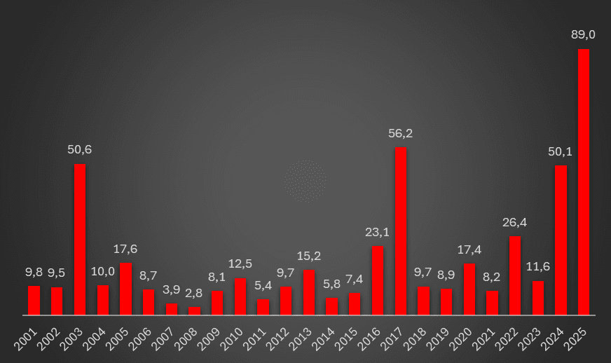 Se compararmos com outros anos, percebe-se a dimensão da falha de 2025, mesmo quando comparado com os três anos com maior aárea ardida. Em 2017, o ano mais catastrófico, apesar dos 9.626 incêndios registados, a eficácia do combate ficou em 56,2 ha/incêndio. Em 2003, foram 9.320 incêndios para um rácio de 50,6 ha/incêndio. Em 2005, o rácio foi de 17,6 com quase 20 mil incêndios.