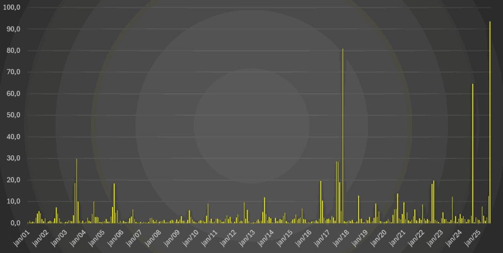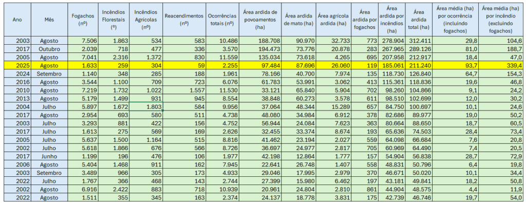 Se a última semana do mês em curso não piorar os valores, Agosto de 2025 ficará apenas aquém dos tristemente lendários meses de Agosto de 2003 (312 mil hectares) e de Outubro de 2017 (289 mil hectares), neste caso ardidos em pouco mais de 24 horas devido a fenómenos meteorológicos absolutamente atípicos. ↓