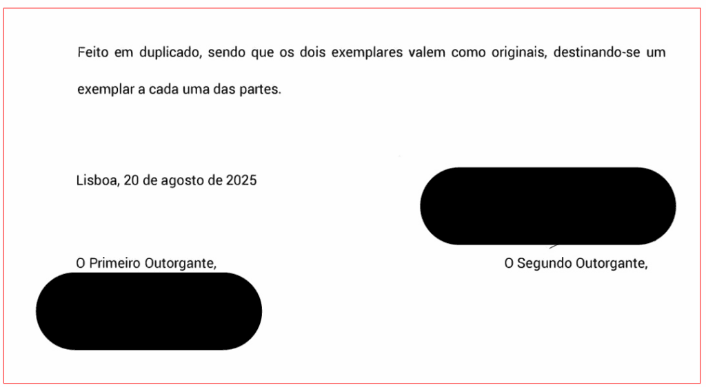 Apesar de ter disponibilizado cópia do alegado contrato na conferência de imprensa — para a qual o PÁGINA UM não foi convocado —, o documento do ajuste directo com a empresa MNTC ostenta a data de 20 de Agosto, mas apresenta diversas anonimizações (isto é, ocultação de informação em documentos, normalmente através de tarjas pretas ou outros meios, com o objectivo de proteger dados pessoais ou sensíveis), incluindo nas assinaturas do próprio presidente da Carris e de uma das suas vice-presidentes.