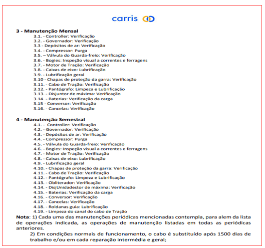 No caso da Glória (e também do Lavra), o caderno de encargos limita-se a exigir uma “verificação” dos cabos, sem qualquer norma técnica específica, periodicidade diferenciada ou referência a métodos de ensaio. Ou seja, se já se sabe que a inspecção diária era apenas visual, como demonstram os registos entregues pela Carris, nenhuma exigência existia para que as outras inspecções com periodicidade semanal, mensal e semestral fossem diferentes. Fica, porém, por esclarecer se a empresa responsável pela manutenção — a MNTC — complementava essas verificações com algum tipo de ensaio mais aprofundado, uma vez que o contrato não o exigia expressamente. ↓