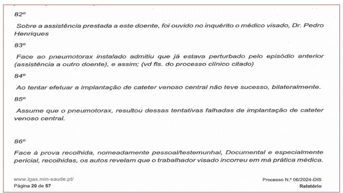 O tempo, porém, é um juíz teimoso, embora muitas vezes injusto. Ontem, o PÁGINA UM revelou em primeira mão que a Inspecção-Geral das Actividades em Saúde (IGAS) concluiu, após um processo disciplinar de 59 páginas, que Pedro Cavaco Henriques cometeu em 2023 cinco infracções graves em apenas três meses, todas elas por violação da leges artis, algumas com consequências graves para os doentes. A reincidência foi um factor agravante, já que o médico tinha antes sofrido uma repreensão escrita. Mesmo assim, a sanção proposta foi de apenas 40 dias de suspensão, com perda de retribuição e antiguidade.