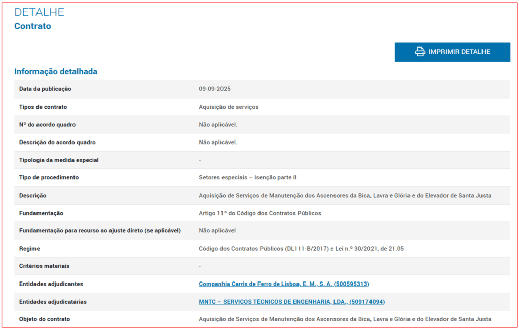 O contrato agora publicado no Portal BASE é o mesmo que a Carris tinha enviado ao PÁGINA UM – e só uma análise forense poderá determinar se foi efectivamente assinado a 20 de Agosto ou apenas após o acidente –, contendo já as assinaturas de dois administradores da Carris e do gerente da MNTC. Tem um prazo de 153 dias, decorrendo assim até 31 de dezembro de 2026, e um montante máximo de 221.333 euros, mas, segundo as cláusulas, não será executado se os elevadores permanecerem inactivos.