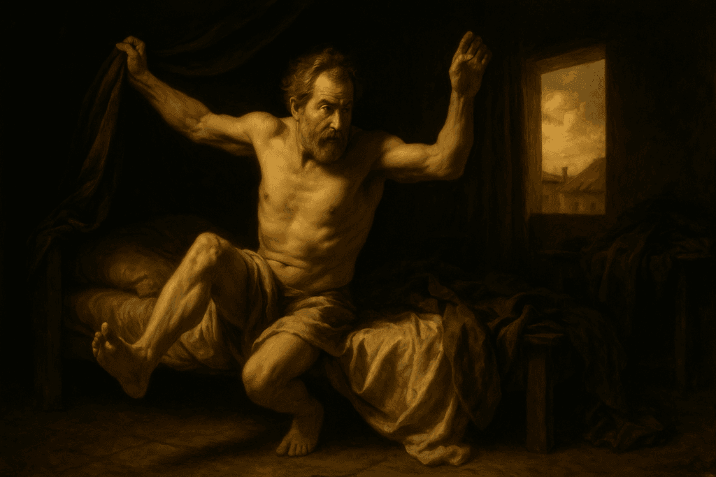 Às cinco da tarde, com um pontapé, livrou-se do lençol e saltou da cama. Em vez de encaminhar-se diretamente para a cozinha, como fazia sempre, espreguiçou-se demoradamente. Depois, entreabriu a janela.