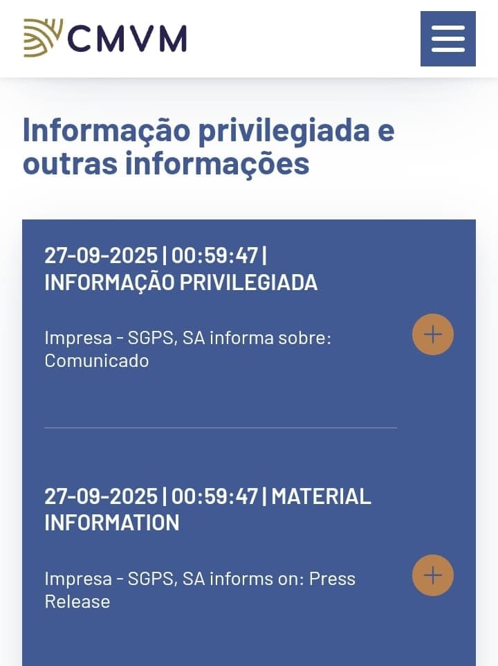 Também curioso é observar o facto de o comunicado da Impresa no site da CMVM, que só por si constitui “informação privilegiada” (daí a publicação), terminar com a frase: “Caso venha a existir informação privilegiada, será feita comunicação ao mercado nos termos previstos no artigo 29.º-Q do Código dos Valores Mobiliários e do Regulamento (UE) n.º 596/2014, do Parlamento Europeu e do Conselho, de 16 de abril de 2014”.