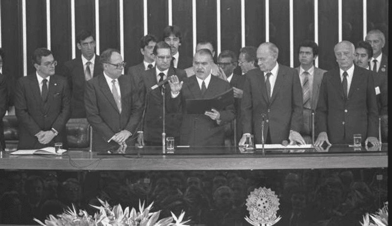 Lugar-tenente da ditadura que saíra pela porta dos fundos do Palácio do Planalto junto com seu último general-ditador, João Figueiredo, Sarney pelo menos cumpriu o guião desenhado por Tancredo. Completou a transição democrática ao nomear o ministério indicado pelo falecido presidente, tentou promover a estabilização económica através de dois planos malogrados (Cruzado I e Cruzado II) e, o que é mais importante, convocou para o ano seguinte uma Assembleia Nacional Constituinte, destinada a entregar ao país uma carta democrática, em oposição ao entulho autoritário herdado dos militares. ↓