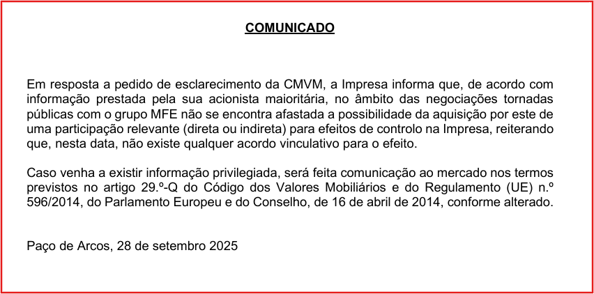 Ao final desta tarde, a Impresa, pressionado pela CMVM, fez novo comunicado ao mercado onde admite que “no âmbito das negociações tornadas públicas com o grupo MFE não se encontra afastada a possibilidade da aquisição por este de uma participação relevante (direta ou indireta) para efeitos de controlo na Impresa, reiterando que, nesta data, não existe qualquer acordo vinculativo para o efeito”.