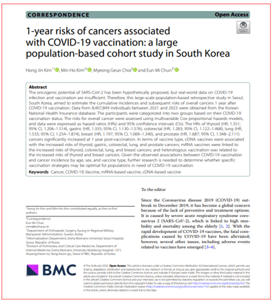 A investigação de cientistas sul-coreanos, de diversas instituições de Seul, abrangeu mais de 8,4 milhões de cidadãos, com dados recolhidos entre 2021 e 2023, e, na comparação dos riscos entre vacinados e não vacinados – utilizando modelos estatísticos ajustados por múltiplas variáveis –, encontrou uma possível associação entre pessoas vacinadas e um aumento da incidência de vários tipos de cancro ao fim de um ano. Os resultados apontam para aumentos estatisticamente significativos no risco de cancro da tiroide (risco relativo de 1,35), do estômago (1,33), do cólon (1,28), do pulmão (1,53), da mama (1,20) e da próstata (1,69), em comparação com os não vacinados.