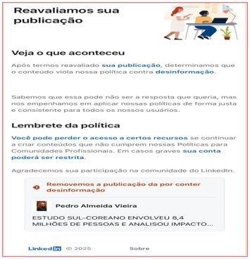Menos de uma hora após a publicação, removeu o post por “desinformação”. Apresentei recurso, assumindo ser um post de um jornalista sobre um artigo noticioso baseado numa revista científica de prestígio; responderam de forma automática, sem argumentos, confirmando a censura e ameaçando encerrar a minha conta.