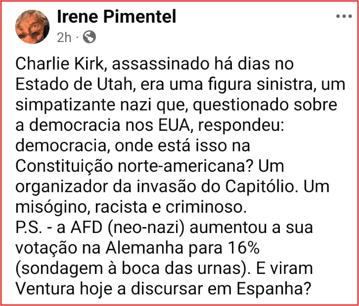 Vem este artigo a propósito de uma publicação que a historiadora portuguesa Irene Pimentel fez na rede social Facebook, na sequência do homicídio, nos Estados Unidos, do jovem conservador e cristão Charlie Kirk.