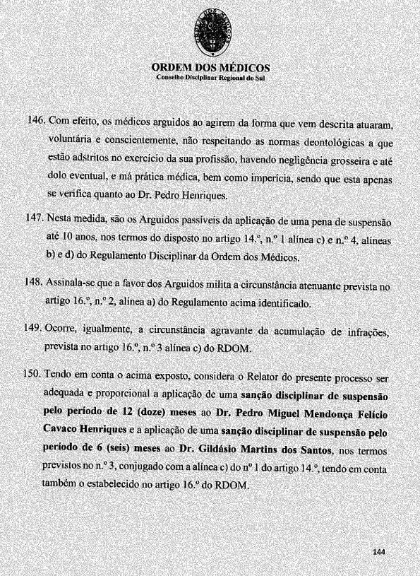 No fecho do despacho, o relator conclui que os dois médicos “agiram voluntária e conscientemente, não respeitando as normas deontológicas a que estão adstritos, havendo negligência grosseira e até dolo eventual”. Considera, assim, demonstrada “má prática médica e imperícia”, esta última apenas imputável a Pedro Henriques.