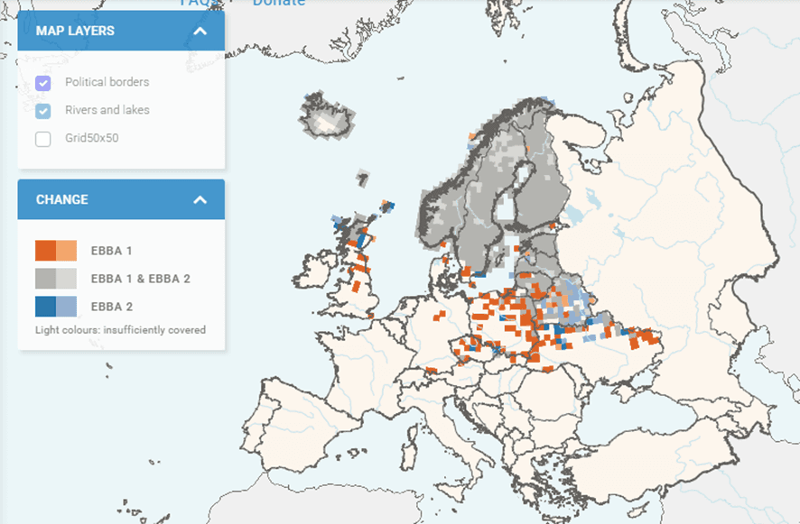 O segundo atlas europeu de aves nidificantes, ou European Breeding Bird Atlas (EBBA2), publicado em 2020, expõe detalhadamente as alterações registadas desde o EBBA1, realizado na década de 1980. Os mapas que se seguem foram retirados do site do EBBA2.