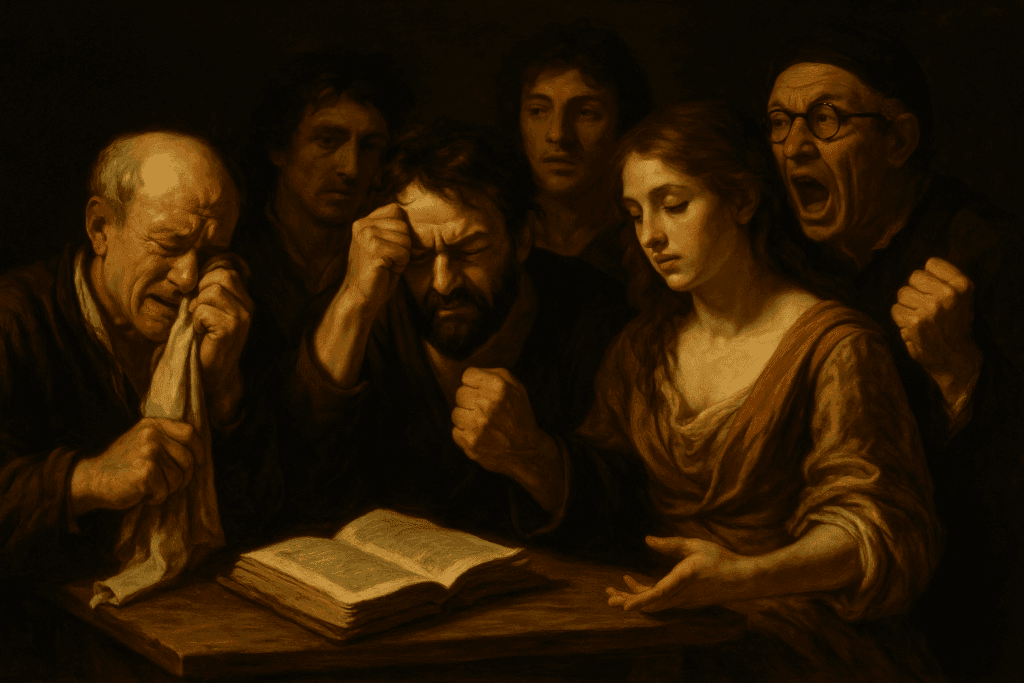 Primeira espécie: os Racionais Emotivos. São aqueles que raciocinam chorando — ou bufando de indignação —, os filósofos de lenço e punho cerrado. Constroem silogismos entre soluços ou imprecações e citam Kant com os olhos húmidos ou as veias do pescoço túrgidas. A lógica deles é uma elegia com surtos de fúria; o raciocínio, uma ópera em permanente crescendo. Confundem clareza com comoção e julgam que o argumento só é verdadeiro se arrancar lágrimas ou gritos à plateia. São os discípulos tardios de Rousseau e de todos os sentimentalistas inflamáveis, que acreditam que a emoção é o selo da verdade e a lágrima — ou o berro — a prova empírica da alma.