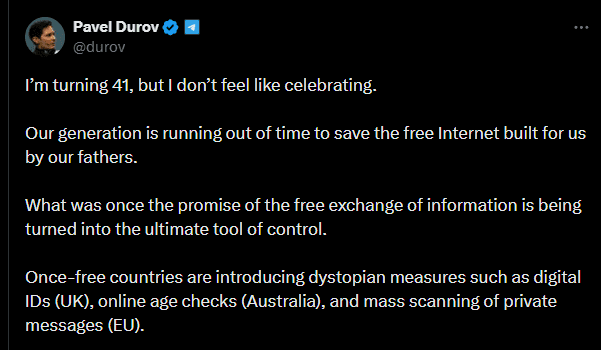 Pavel Durov, fundador e presidente-executivo da plataforma de mensagens encriptadas Telegram, alertou hoje, numa mensagem difundida online, para esse caminho distópico que já se vive na Europa. “Um mundo negro e distópico aproxima-se rapidamente — enquanto dormimos. A nossa geração arrisca ficar na História como a última que tinha liberdades — e que permitiu que elas fossem eliminadas.”