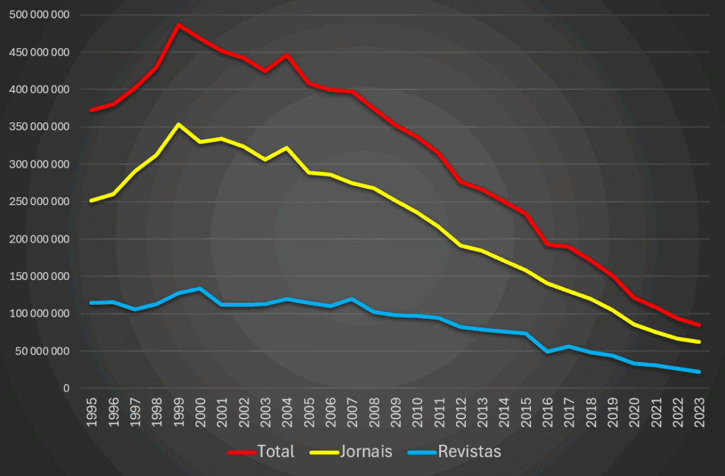 Os dados das tiragens em papel revelados pela Associação Portuguesa para o Controlo de Tiragem e Circulação (APCT) deste ano confirmam o colapso: o Público vende menos de 10 mil exemplares diários em papel, o Diário de Notícias mal ultrapassa 900, o Jornal de Notícias desceu para 16 mil, o Expresso para cerca de 33 mil por edição, e a revista Sábado fica-se nos 13 mil. O Correio da Manhã, outrora o bastião popular, regozija-se por vender “mais de 34 mil por dia”, o que ainda assim representa menos de um terço do que vendia em 2011. A popular revista Maria, que em 2008 vendia 325 mil exemplares por semana, está agora com vendas da ordem dos 23 mil. São números que confirmam a tendência captada pelo INE: um colapso social e económico da leitura impressa.