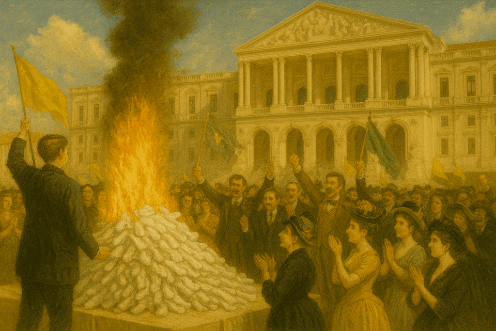 Imagino já o entusiasmo público: marchas de correcção moral desfilando pela Avenida da Liberdade, bandeiras empunhadas contra o calção rasgado e o boné virado ao contrário. O Diário da República publicaria, a cores, o pantone oficial das gravatas patrióticas. E, em apoteose, celebrar-se-ia o Dia Nacional da Elegância Cívica — ocasião em que os portugueses, lavados e compostos, queimariam solenemente uma montanha de peúgas brancas em frente ao Parlamento, símbolo da purificação estética da nação.