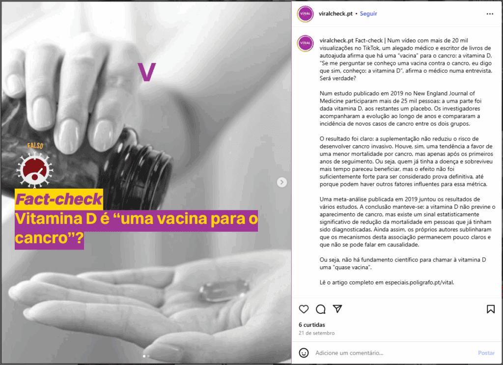 Tomemos o exemplo recente de um artigo sobre a vitamina D, que o Polígrafo classificou como “FALSO”. Segundo a peça, um “alegado médico e escritor de livros de auto-ajuda” teria dito, numa entrevista, que a vitamina D funcionava como uma “vacina para o cancro”. O Polígrafo decidiu pegar na frase — isolada, sem citar o nome do autor nem o contexto — e analisá-la literalmente. Ora, esse é o primeiro erro científico: confundir linguagem metafórica com proposição factual. Quando alguém diz que a vitamina D é “como uma vacina”, a comparação não é imunológica, é simbólica — remete para o potencial preventivo ou terapêutico, não para um mecanismo biológico idêntico ao das vacinas contra bactérias ou vírus.