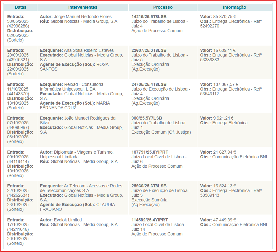 Este mês, o primeiro processo, deu entrada a 7 de Outubro, e é relativo a uma dívida no valor de 9.921,24 euros da Global Notícias a João Manuel Rodrigues da Silva, que foi designer na empresa entre Novembro de 1996 e Maio de 2024. ↓