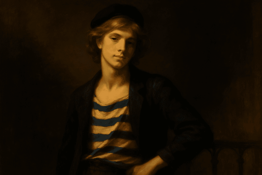 Boina francesa, cinzento-escura. Um casaco curto, azul-marinho, aberto sobre a blusa de riscas largas, azuis e brancas. Calças soltas. O corpo ligeiramente inclinado, apoia-se sobre a frágil grade que delimita o terminal rodoviário.
