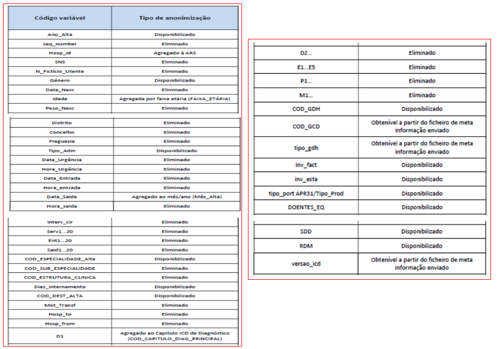 Todas as restantes devem ser integralmente disponibilizadas, incluindo variáveis que permitem uma análise epidemiológica e hospitalar detalhada, como o hospital de internamento, o concelho de residência, a data do internamento e a evolução das doenças ou afecções e o desfecho clínico (alta, transferência ou morte).