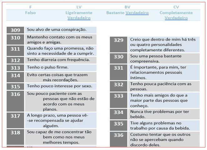 Havia igualmente uma vertente quase caricatural na tentativa de detectar impulsividade ou descontrolo emocional, com itens como “Às vezes, expludo e perco o controlo sobre mim”, “Quando me enfureço, é muito difícil acalmar-me”, “Faço muitas coisas perigosas só pela emoção que me causam” ou “Quando estou a conduzir e me indigno com os outros condutores, faço para que deem conta disso”. E não faltavam formulações de tom paranóide ou delirante, como “Algumas pessoas fazem coisas para me deixar mal”, “Às vezes, misturo os pensamentos uns com os outros” ou “Certas partes do meu corpo ficaram sem sensibilidade, sem que eu saiba o porquê”.
