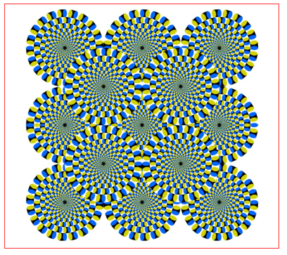 O círculo de serpentes coloridas criado por Akiyoshi Kitaoka – a Rotating Snakes Illusion – é um desses fenómenos que deixam o observador desconcertado. Mesmo sabendo que a figura é estática, ela continua a rodar.