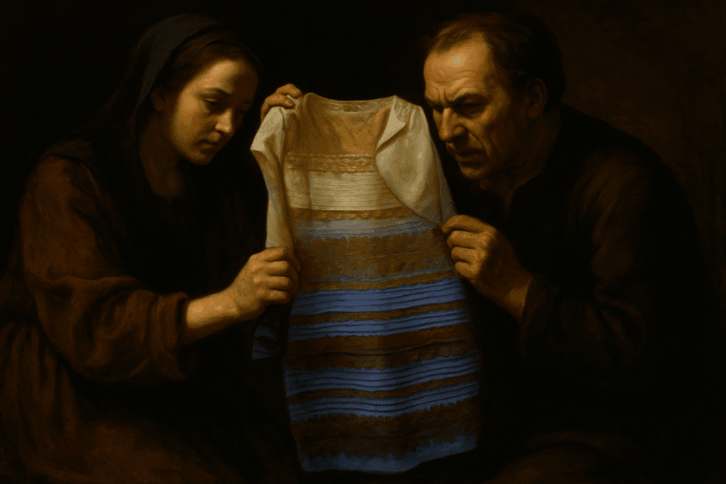Duas pessoas olham para o mesmo conjunto de factos e veem realidades opostas, como quem vê azul e preto ou branco e dourado. O testemunho, o vídeo, a fotografia, a perícia: tudo é lido à luz dos priors de cada um, do seu contexto, das suas experiências, daquilo que espera ver (um imenso mundo subjectivo).