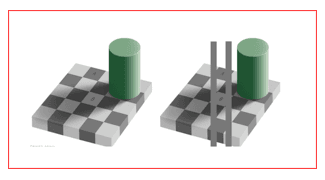 Na ilusão da sombra no tabuleiro de xadrez (Checker Shadow Illusion), criada por Edward Adelson, acontece algo ainda mais intrigante: dois quadrados com a mesma tonalidade de cinzento parecem um claro e outro escuro, apenas porque um deles está dentro da zona de sombra projectada por um cilindro. A única forma de convencer o cérebro é traçar uma linha vertical da mesma cor que una ambos e comparar cada quadrado com a linha – e mesmo assim, olhando de novo, a ilusão reaparece (sempre que compararmos os quadrados directamente sem ser com a linha vertical).