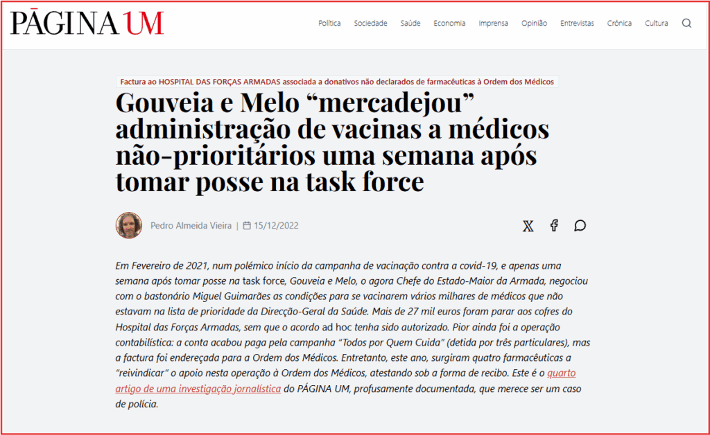 Foi isso que fez Pedro Almeida Vieira quando investigou e noticiou os vários escândalos em torno da campanha “Todos por quem cuida” promovida pela Ordem dos Médicos e a Ordem dos Farmacêuticos. (Curiosamente, três dos envolvidos nas polémicas da campanha “Todos por quem cuidam” provaram que tinham ambições políticas e aproveitaram bem a pandemia para “subir”: Miguel Guimarães é deputado do PSD; Ana Paula Martins, ex-bastonária da Ordem dos Farmacêuticos, é ministra; Gouveia e Melo é candidato à Presidência da República.)